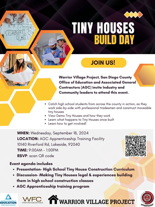 What: The Warrior Village Project, San Diego County Office of Education, and WorkforceConnect are sponsoring the inaugural Tiny Houses Build Day, at host Associated General Contractors Apprenticeship & Training facility.